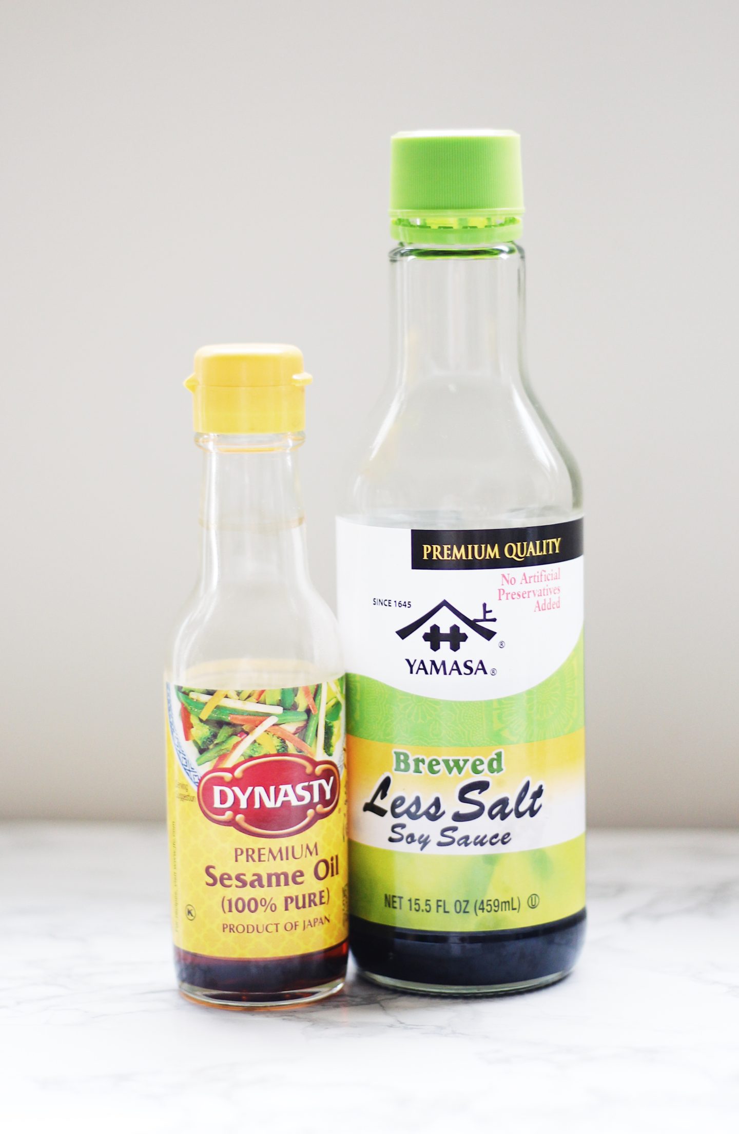 3. Add in the low sodium soy sauce, sesame oil, ginger, & chili flakes to the cauliflower rice. Stir well.