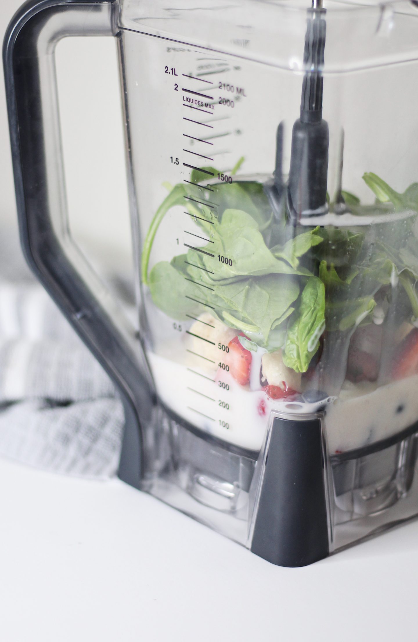 After the fruits and greens are added, I put in some almond milk. I like the unsweetened vanilla since it’s lower in sugar and carbs and to be honest, I don’t need the added sweetness. Aside from the nutrients in almond milk, this will help create the creaminess in the smoothie.