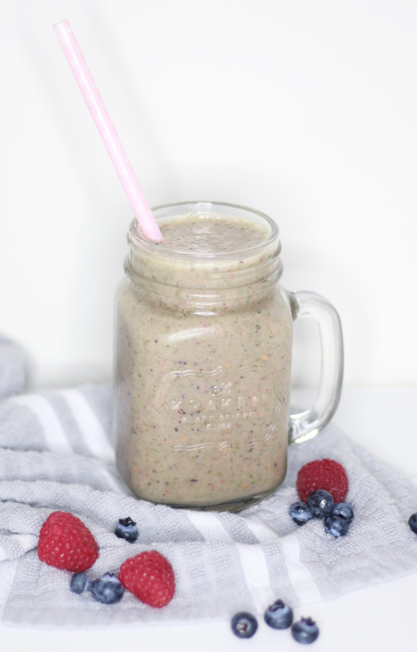 Now I don’t know if I’ll ever be the girl that can have some nasty smoothie that’s strictly greens and a bunch of supplements, but I have found a way to get these things in while still having a smoothie that tastes delicious. It’s loaded with berries, greens, and protein. What more could you ask for?