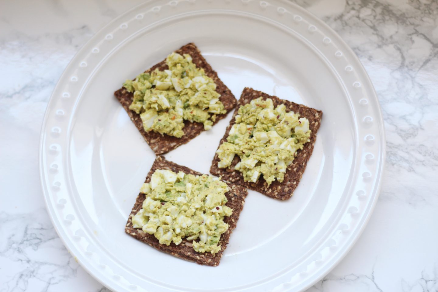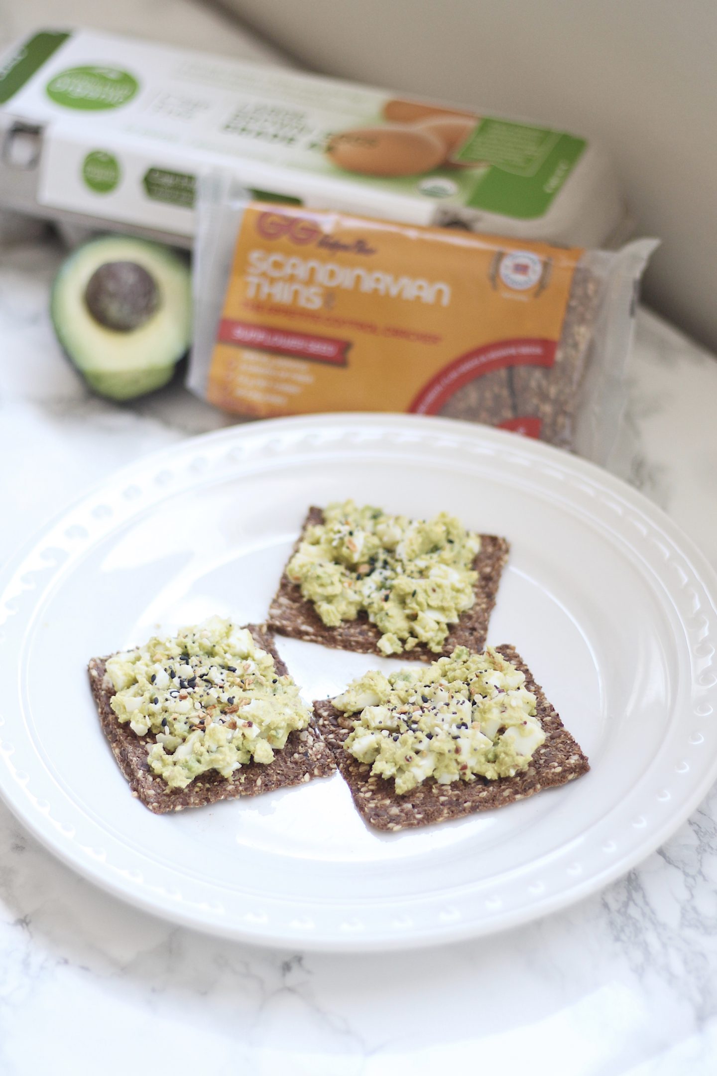 I make my avocado egg salad for one as my boyfriend typically isn’t up in time for breakfast, but this recipe is super simple to double up if needed. I wouldn’t make any extra as the avocado will start to brown. This egg salad is good on it’s own, in a sandwich, or topped on whatever you like. I put mine on a few GG crackers for an extra serving of fiber in the mornings, but it would be amazing on some toasted sourdough bread for a twist on the classic avocado toast.