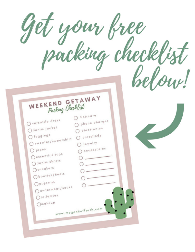 Now that I’ve shared the main traveling essentials with you, I want to help you out just a little bit more! I have created a super cute, super organized FREE packing checklist for your next weekend getaway! It includes the 10 things I talked about above as well as your other necessities (ya know underwear, your phone charger, etc.) so you don’t forget a thing. All you have to do is enter your info below and you will get it sent straight to your inbox!