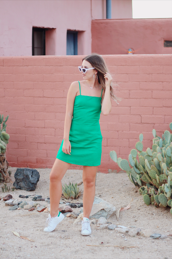 I love that sneakers are so on-trend lately. They are the perfect thing to bring along while traveling because they are comfortable, stylish, and go with a multitude of different outfits. I typically bring along my Adidas Stan Smiths or my white Converse because they look great with pants, shorts, dresses, leggings, you name it! Try and pack a pair that you can wear with several different outfits.